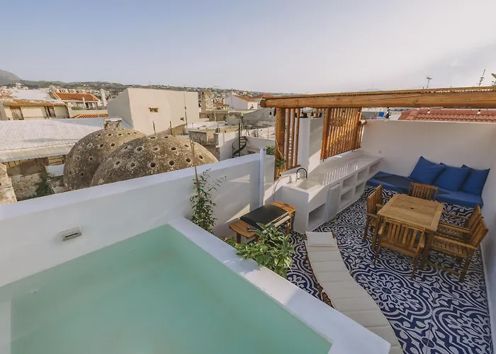 De 2-slaapkamer Minoos Residence With Roof Pool Rethimnon villa bevindt zich op wandelafstand van 25 minuten van Agigma Massage & Therapies (wellnesscentrum) en beschikt over een terras met uitzicht op de stad.